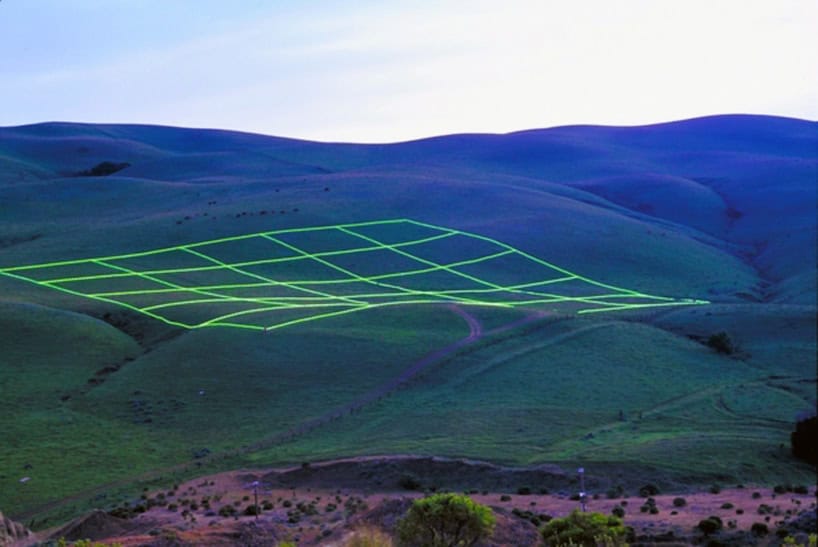 “Luminous Earth Grid, an array of 1,680 energy-efficient fluorescent lamps, swept over 10 acres of undulating landscape, 50 miles north of San Francisco. Said the artist, “I see the project as a poetic statement on the potential harmony between technology and nature.” Over a five year period, Williams launched a rigorous fund raising campaign throughout Northern California, and raised nearly half a million dollars to realize the massive project. It was widely acclaimed by critics around the globe and drew tens of thousands of visitors.” –Behance Network